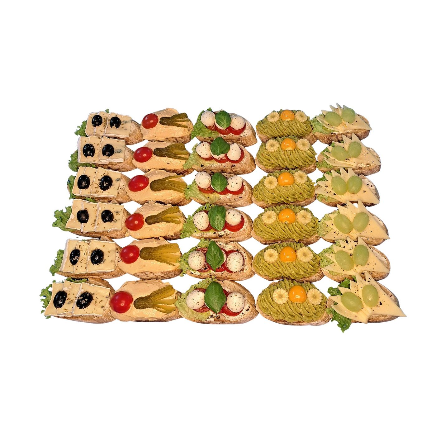 - 1 Platte Canapé - vegetarisch (5 verschiedene Sorten = 30 Stück / Platte) mit Bavaria Blue, bayerischer Obazda, Tomate-Mozzarella, Avocadocreme und mittelgereifter Gouda