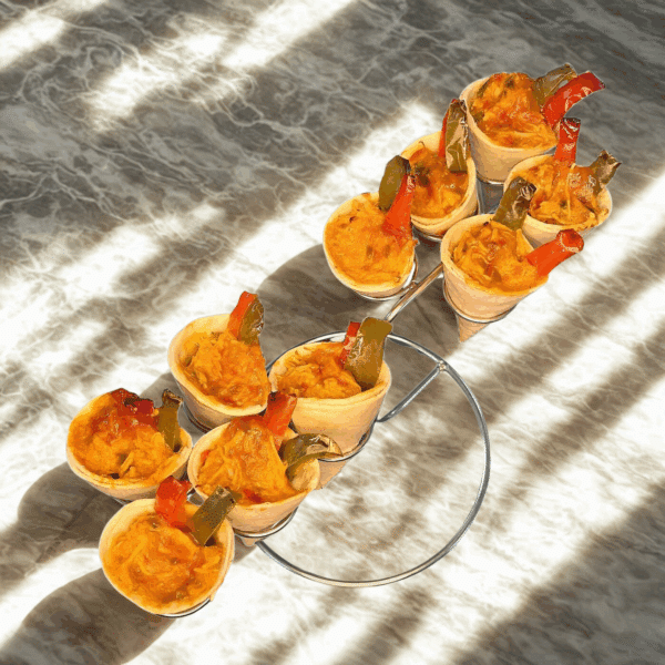 Diese herzhaften Mini-Wraps sind ein echter Genuss für Fleischliebhaber: Gefüllt mit zart mariniertem Hähnchenbrustfilet, saftigen Paprikastreifen und abgerundet mit einer würzig-rauchigen BBQ-Sauce. Perfekt portioniert und warm serviert – ideal für Buffets, Firmenevents oder private Feiern.